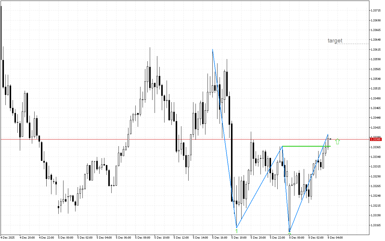 На графике сформировался паттерн Двойное дно, указывающий на возможный разворот вверх. Важным сигналом для подтверждения этого паттерна является пробой линии шеи, расположенной на уровне 1.33367. Пробой линии шеи подтверждает разворот тренда и открывает возможности для дальнейшего роста цены. Для этого мы должны увидеть закрепление цены выше этой линии.